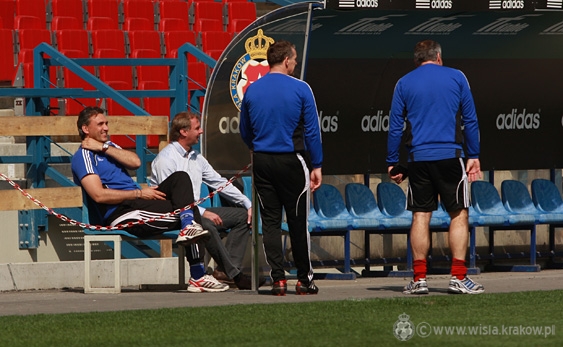 Zawodnicy, którzy nie zagrali w niedzielnym meczu w tym samym czasie ćwiczyli z trenerem Moskalem na boisku głównym. W Krakowie nie ma jedynie Mateusza Kowalskiego i Filipa Kurto, którzy pojechał z drużyną Młodej Wisły na mecze do Białegostoku i Poznania. Podopieczni trenera Kulawika bowiem po dzisiejszym meczu z Jagiellonią udają się bezpośrednio na zaległy mecz z Lechem, który rozegrają w czwartek.