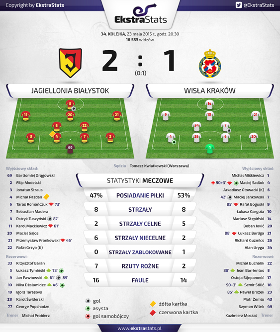 Data publikacji: 23-05-2015 23:00Drużyna Białej Gwiazdy w meczu 34. kolejki T-Mobile Ekstraklasy rywalizowała z Jagiellonią Białystok. Poniżej przedstawiamy, jak prezentują się statystyki po spotkaniu z zespołem Michała Probierza.