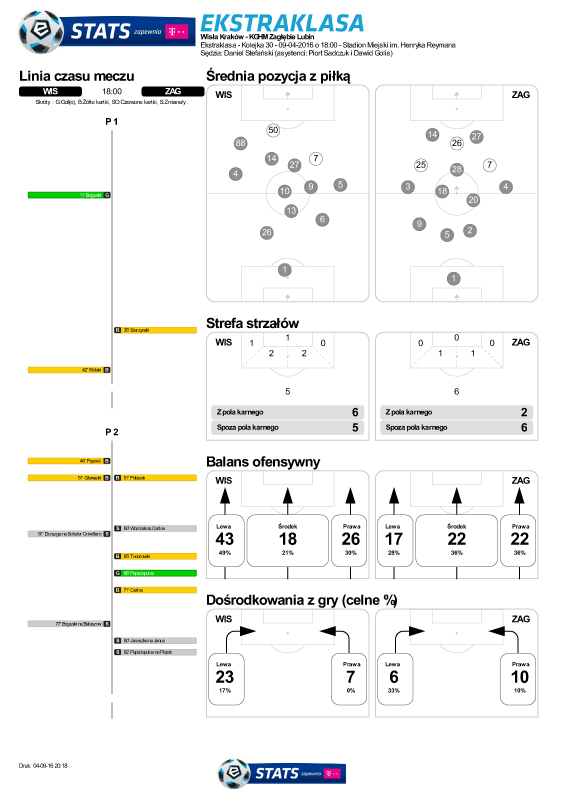 Data publikacji: 09-04-2016 20:56Od sezonu 2015/2016 Ekstraklasa SA wraz ze swoim partnerem technologicznym, firmą T-Mobile, uruchomiła system statystyk meczowych. Zapraszamy do analizy po meczu Wisła Kraków - Zagłębie Lubin.