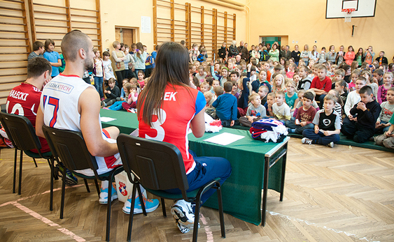 Siatkarka Patrycja Gądek, koszykarz Paweł Murza oraz piłkarz Patryk Małecki przybyli dziś do Szkoły Podstawowej nr 86 im. Powstańców Śląskich w Krakowie na os. Jagiellońskim 18, by przybliżyć młodym fanom świat sportu. O organizację tego cyklu spotkań, cieszących się wśród najmłodszych mieszkańców Małopolski dużym zainteresowaniem, dba Stowarzyszenie Kibiców Białej Gwiazdy.