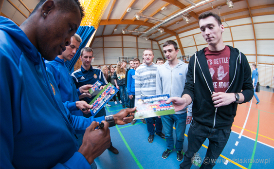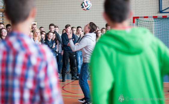 Data publikacji: 13-05-2015 13:18Środowy trening nie był ostatnim punktem piłkarskiego dnia dla dwójki Wiślaków. Łukasz Burliga oraz Donald Guerrier po zajęciach w bazie treningowej udali się na spotkanie z uczniami Zespołu Szkół im. Andrzeja Średniawskiego w Myślenicach.