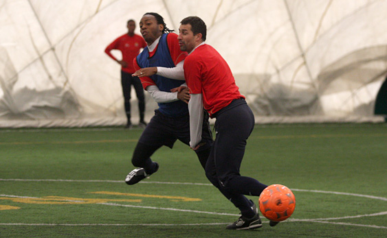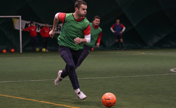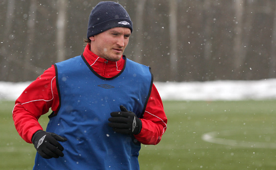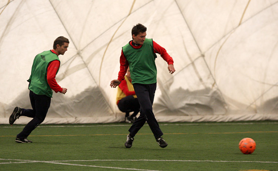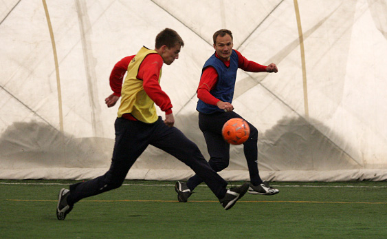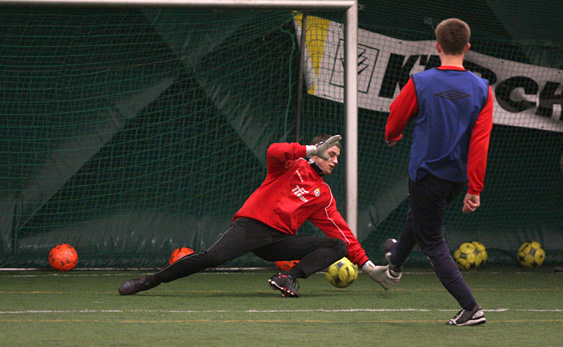 Następne ćwiczenie polegało na rozegraniu akcji jeden na trzech. Dobrze w tym fragmencie radzili sobie Cleber oraz Piotr Brożek, którzy kilka razy zatrzymali atak trójki przeciwników, wzbudzając uznanie u reszty kolegów, przyglądających się grze. Po tym zadaniu przyszedł czas na rozgrywanie akcji zakończonych strzałami na bramkę, a potem na krótką gierkę.