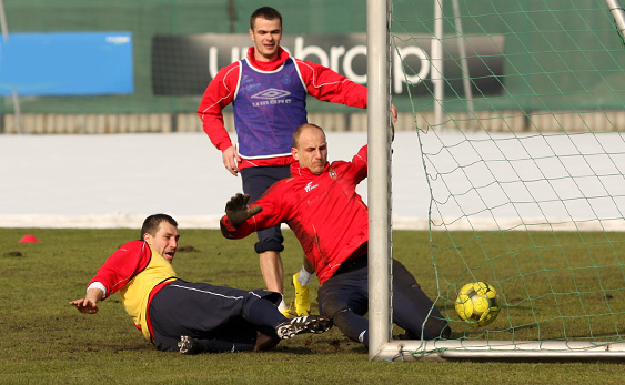 Na połowie boiska zawodnicy mieli kilka gierek treningowych na małych boiskach oraz ćwiczenia strzeleckie. Zabrakło elementów taktyki, ale jak się okazuje nie było to spowodowane zbyt małą powierzchnią boiska, na której nie zalega już śnieg. Już wcześniej ustalono taki plan przygotowań do meczu. „Dziś nie robiliśmy części taktycznej, ale i nie było takich planów. Taktykę ćwiczyliśmy przez ostatnie tygodnie, więc mamy nadzieję, że zawodnicy tego nie zapomnieli. Jutro przypomnimy sobie kilka jej elementów” – tłumaczy trener Rafał Janas i dodaje: „Mamy nadzieję, że z dnia na dzień będziemy mieć coraz lepsze warunki do treningu.”