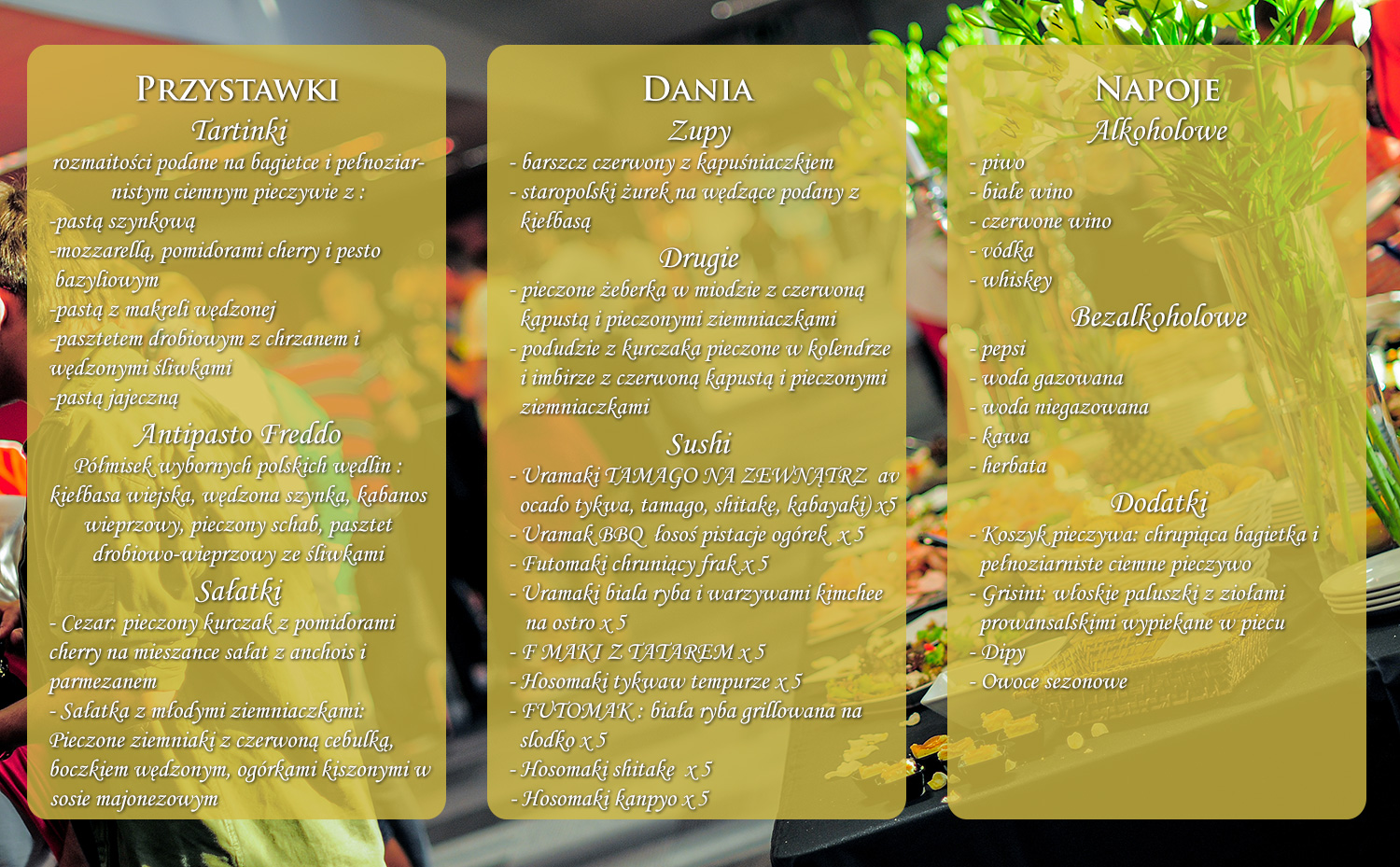 - pełny catering: dania na ciepło i zimno, desery, sushi, napoje alkoholowe i bezalkoholowe