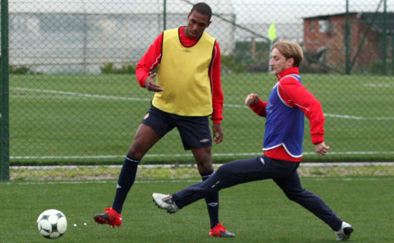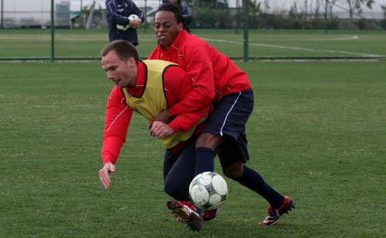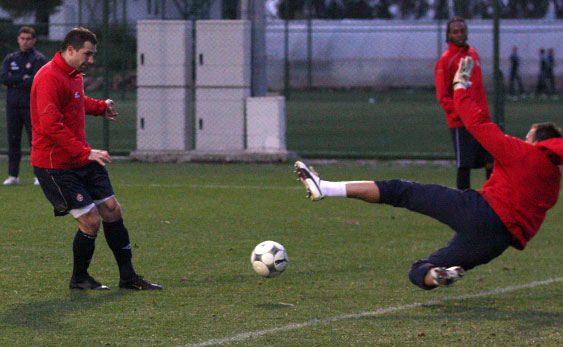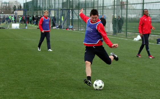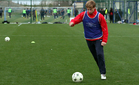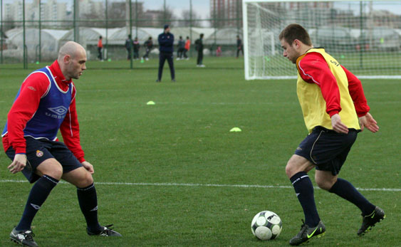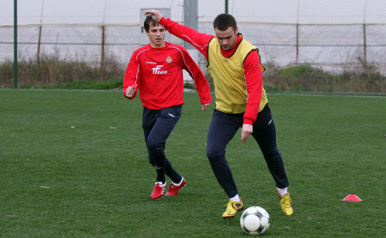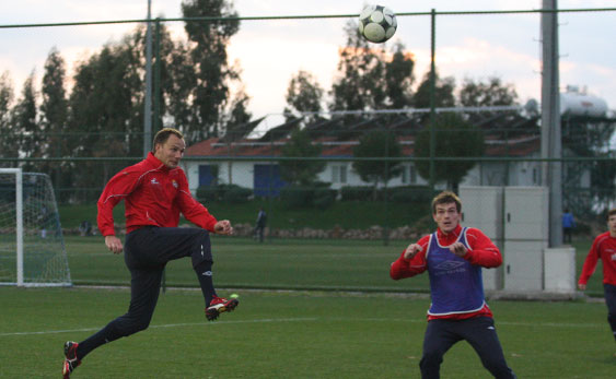 Drugą część zajęć – już w pełni piłkarską, zawodnicy spędzili na doskonaleniu podań ze skrzydła. Najpierw z lewej strony piłki wrzucała czwórka Kirm, Diaz, Poljak, Piotr Brożek, a potem z prawej strony dośrodkowywali Małecki, Chrapek i Kirm. Po podaniach tych piłkarzy padło kilka bardzo ładnych bramek. Chyba najładniejszą zdobył Konrad Gołoś, który skierował piłkę do siatki nożycami.